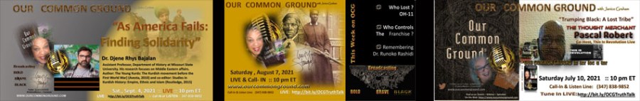 OUR COMMON GROUND Media and Communications produces OUR COMMONGROUND with Janice Graham, an URBAN PROGRESSIVE independent talk radio program examining global and community issues, events, thought, ideas and perspectives in and about the African-American community; TruthWorks Network; and If America Fails?: The Coming Tyranny. OUR COMMON GROUND features guests who bring new ideas, and creative and innovative solutions and opportunities. The website of OUR COMMON GROUND is a great place to learn about community issues, news, Black art and literature, history, find links to the OCG radio program, and explore the many links to related resources. As you work to #FightFascismNow and #DefendDemocracy, peruse the vast collection of resources available at OUR COMMON GROUND. — LMO