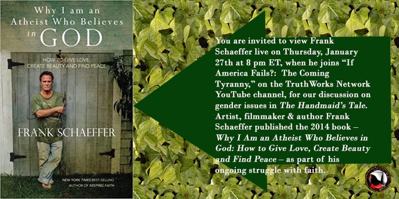 @ASoulAFire @JaniceOCG In 2014 book #WhyIAmAnAtheistWhoBelievesInGod by @Frank_Schaeffer, he wrestles with faith. Frank is live on Thurs., Jan. 27 at 8 pm ET, w/ “If America Fails?” on the TruthWorks Network YouTube channel, for our discussion on gender issues in The Handmaid’s Tale.