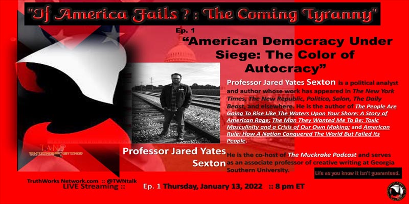 @AtwoodSociety @JaniceOCG See @jysexton in “American Democracy Under Siege: The Color of Autocracy” in 1/13 PREMIERE of “If America Fails?” Jared Yates Sexton presents on how we arrived at place of struggling for democracy. Watch Thursdays, 8 pm ET, 1/20 – 4/7/22, on TWN.