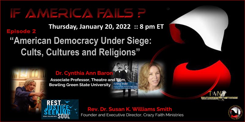 @AtwoodSociety @JaniceOCG See PROMO for LIVE webcast, Thurs., 1/20/22, 8:00 pm ET, feat. @cassady2euca Rev. Dr. Susan K. Williams Smith & Dr. #CynthiaAnnBaron in “American Democracy Under Siege: Cults, Cultures and Religions” – Season 1 of “If America Fails?: The Coming Tyranny.”