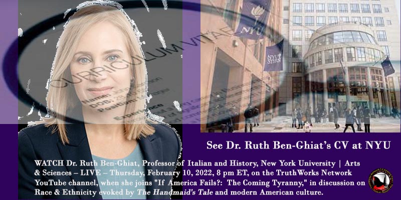 @JaniceOCG See the CV of @ruthbenghiat at NYU. Dr. Ruth Ben-Ghiat is live on Thurs., Feb. 10 at 8 pm ET, w/ “If America Fails?” on the TWN YouTube channel, for our discussion on race & ethnicity in The Handmaid’s Tale & relationship to current challenges to democracy.