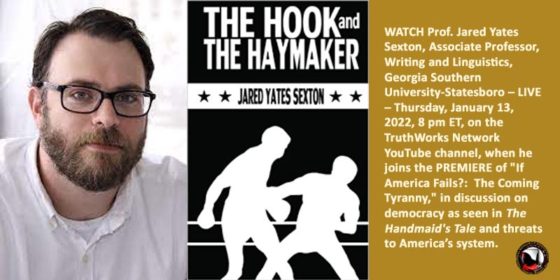@ASoulAFire @JaniceOCG #TheHookAndTheHaymaker is an early work of fiction by @jysexton & @SplitLipPress. Watch a great creative mind at work when Jared Yates Sexton joins 1/13/22, 8 pm ET, on the TWN YouTube channel, PREMIERE of “If America Fails?” in chat on democracy as seen in @HandmaidsOnHulu & threats to America’s system.